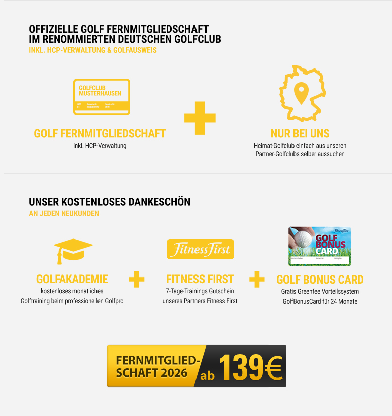 - Stark rabattierte Aktionspreise: Jetzt für die Golf Fernmitgliedschaft 2026 anmelden und von unseren Frühbucher-Rabatten profitieren. Jetzt bereits ab 139€ für das Kalenderjahr 2026